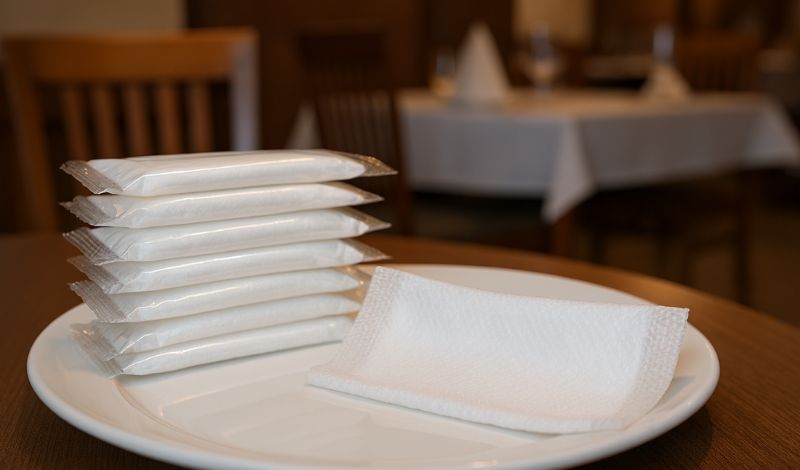 Trong các nhà hàng sang trọng, khăn lạnh thường được đóng gói riêng biệt, có in logo thương hiệu và đôi khi còn được tẩm hương liệu nhẹ nhàng như trà xanh, hoa nhài hoặc bạc hà. Điều này không chỉ mang lại trải nghiệm thư giãn cho khách mà còn tạo dấu ấn thương hiệu riêng biệt. Vải không dệt chất lượng cao, đặc biệt là loại spunlace, thường được sử dụng để đảm bảo khăn mềm mại, thấm hút tốt và không gây kích ứng da.
